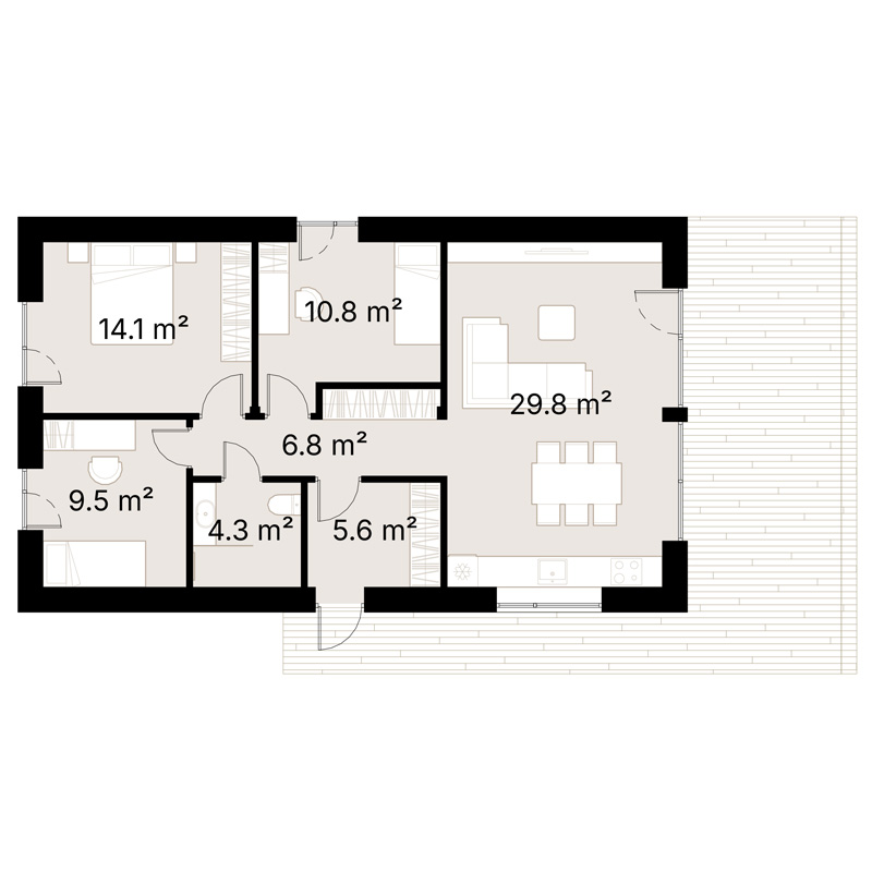 The three bedrooms are well-sized, with the largest being 14.1 m². Each room provides a peaceful retreat, perfect for rest and relaxation or for use as a home office or guest room.