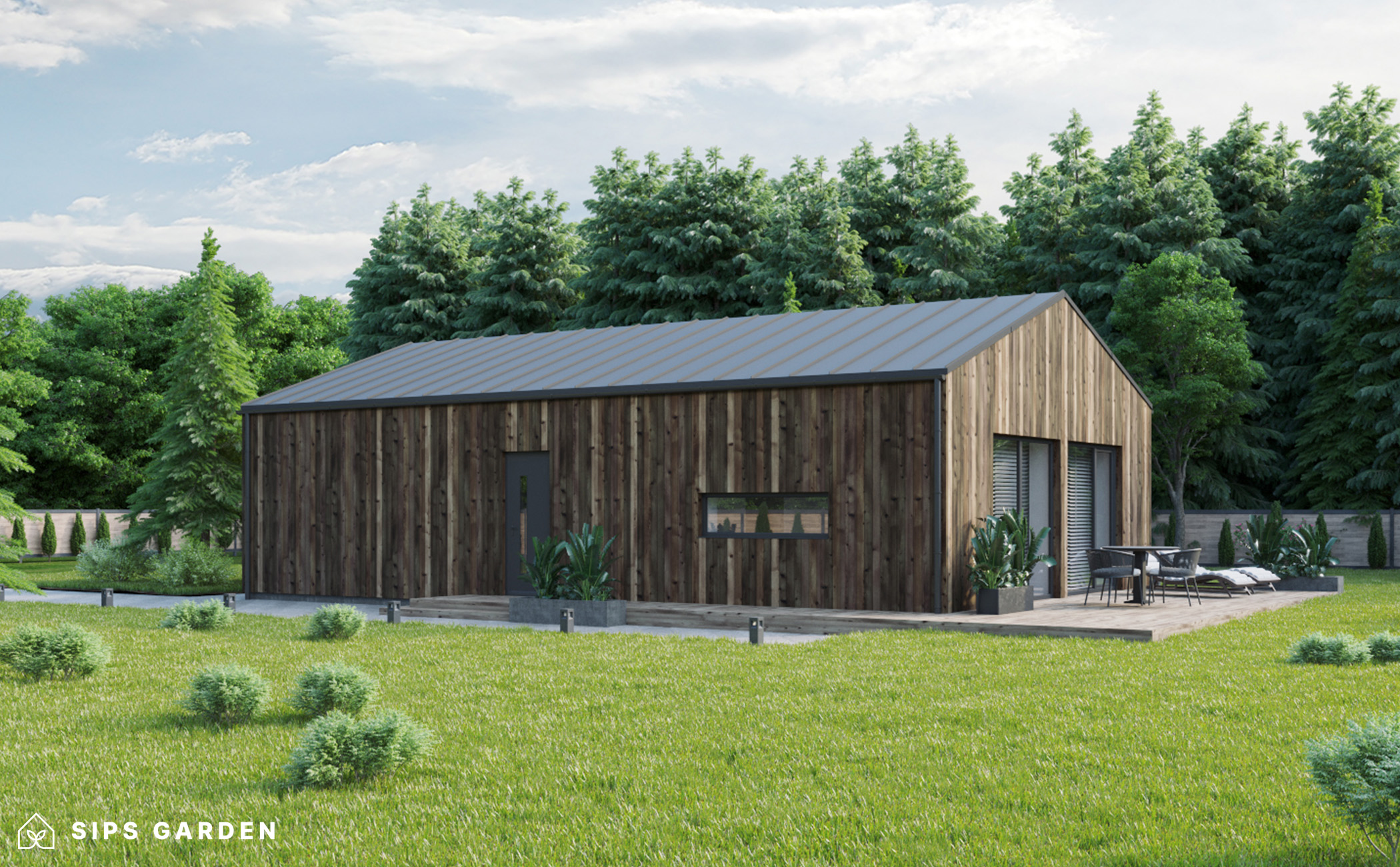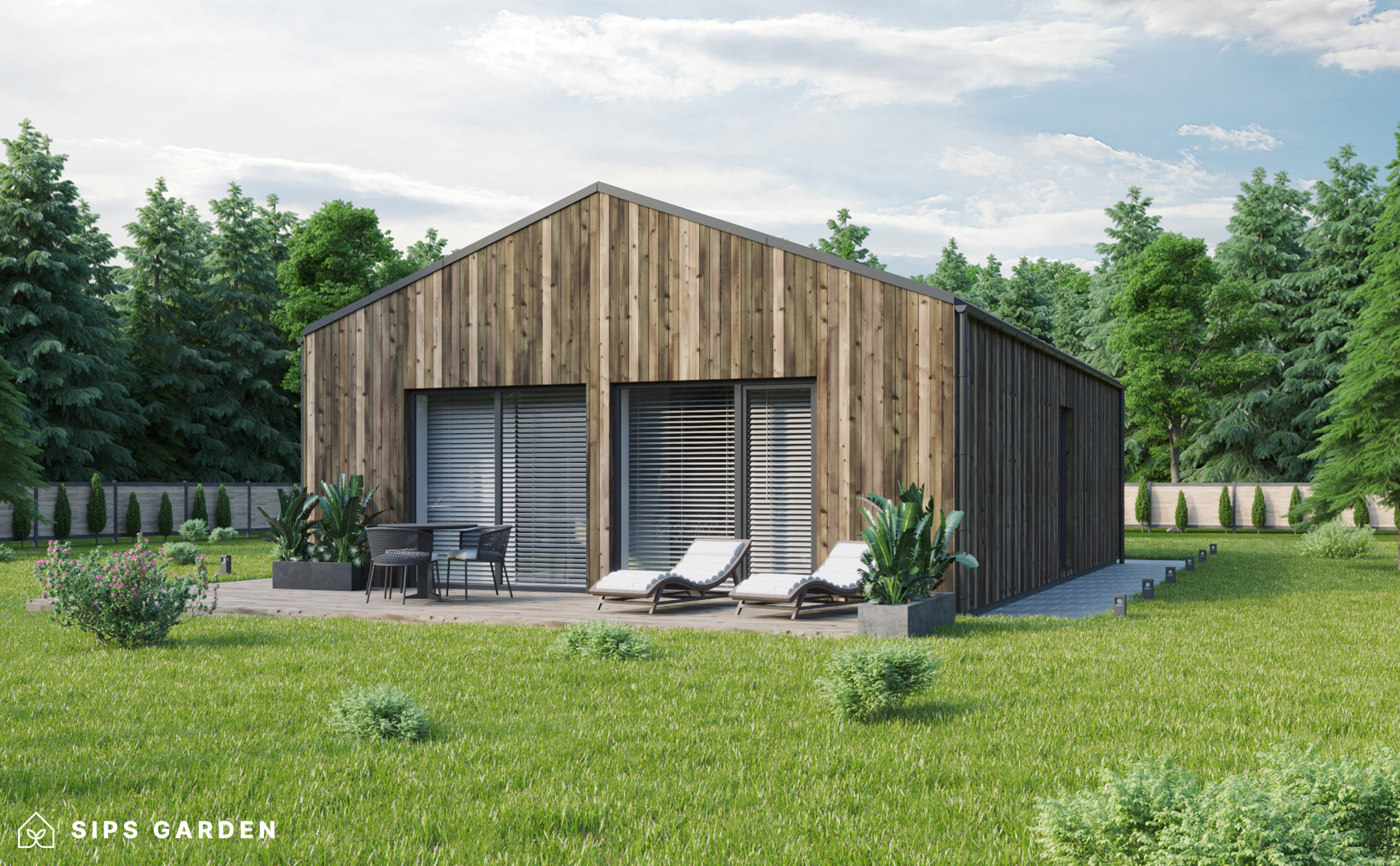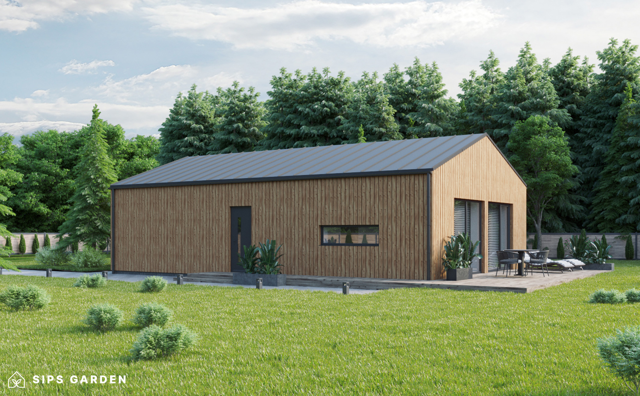 This product is crafted using an advanced, high-quality, and energy-efficient SIPs (Structural Insulated Panels) system, which ensures superior insulation and long-lasting durability. The exterior features anthracite grey PVC double-glazed windows and doors, complemented by an EPDM roof cover, a sturdy steel rain gutter, and elegant steel finishing details, all included as standard elements.