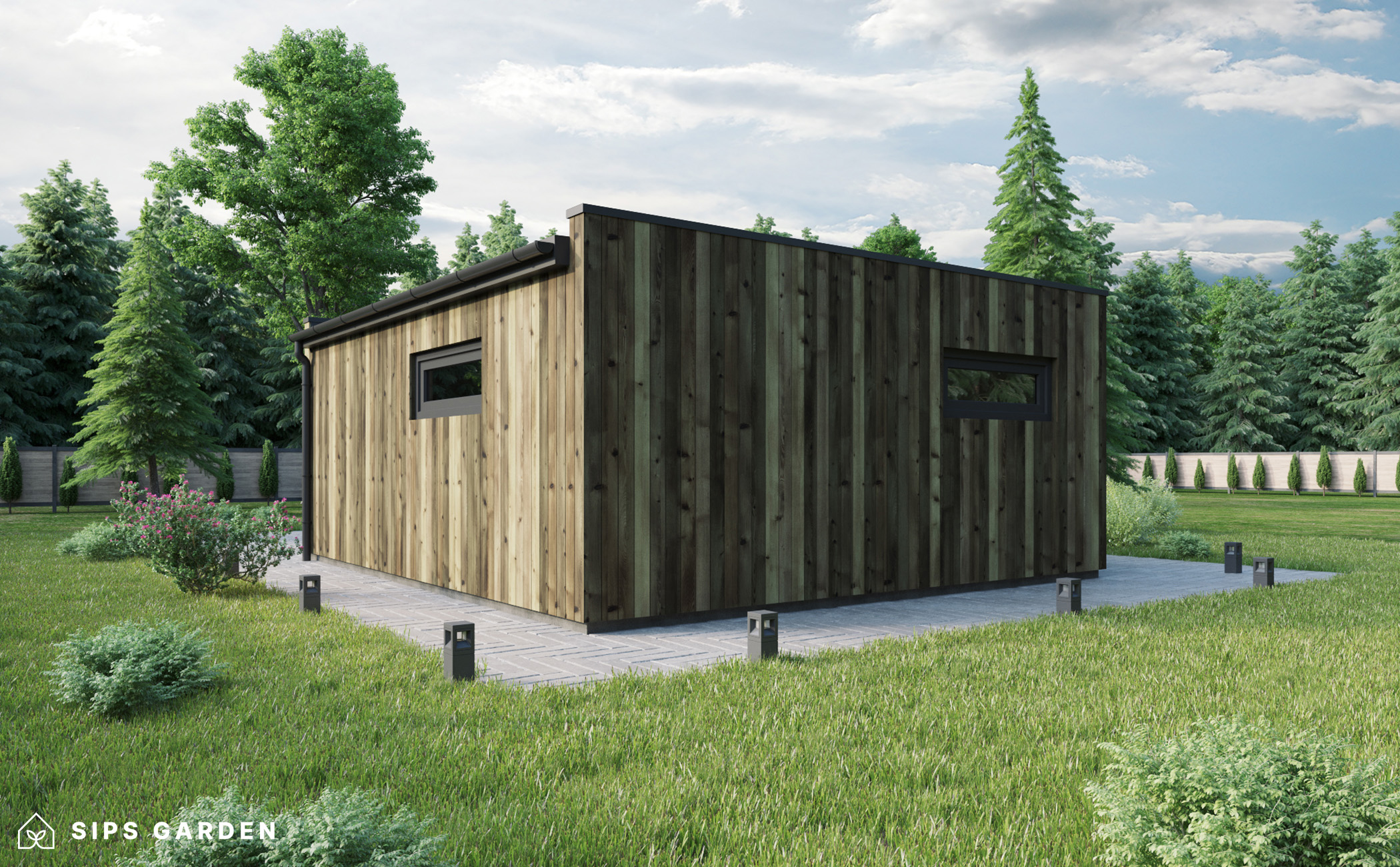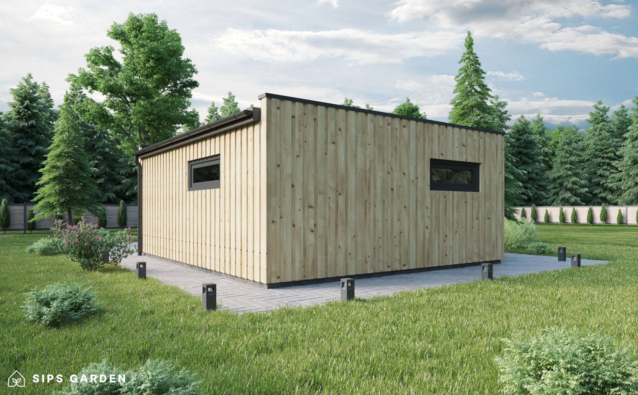 This product is crafted using an advanced, high-quality, and energy-efficient SIPs (Structural Insulated Panels) system, which ensures superior insulation and long-lasting durability. The exterior features anthracite grey PVC double-glazed windows and doors, complemented by an EPDM roof cover, a sturdy steel rain gutter, and elegant steel finishing details, all included as standard elements.