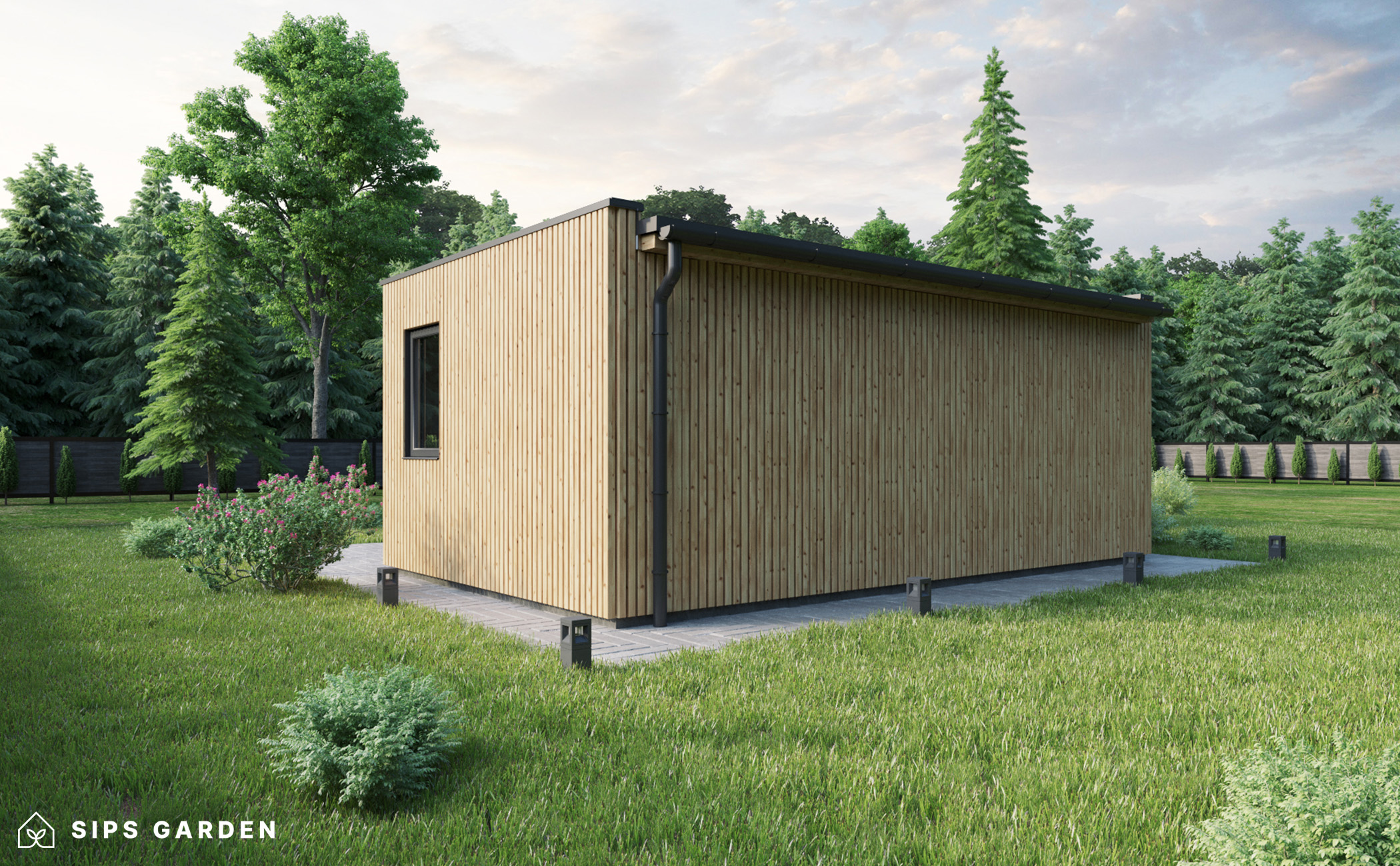 This product is crafted using an advanced, high-quality, and energy-efficient SIPs (Structural Insulated Panels) system, which ensures superior insulation and long-lasting durability. The exterior features anthracite grey PVC double-glazed windows and doors, complemented by an EPDM roof cover, a sturdy steel rain gutter, and elegant steel finishing details, all included as standard elements.