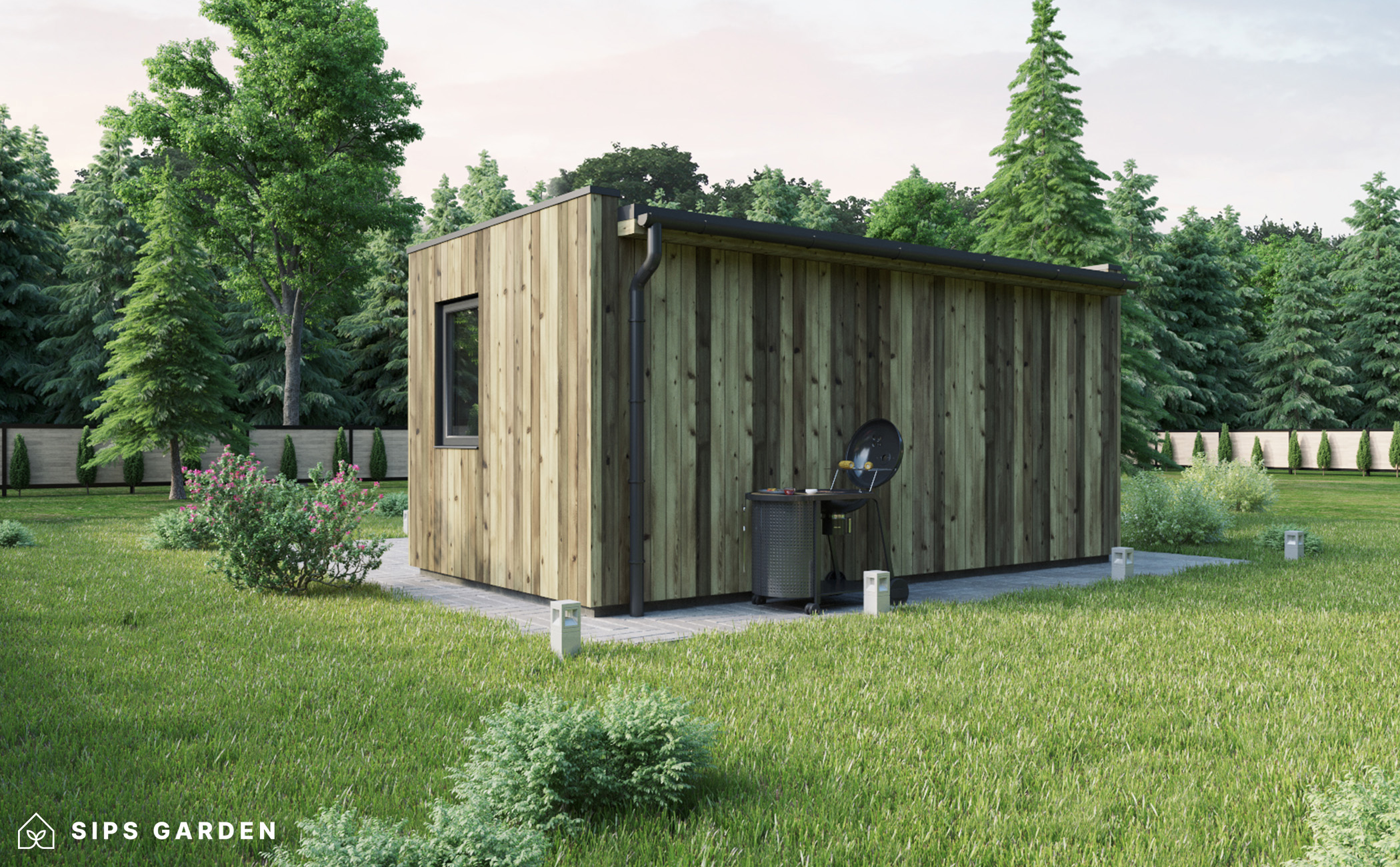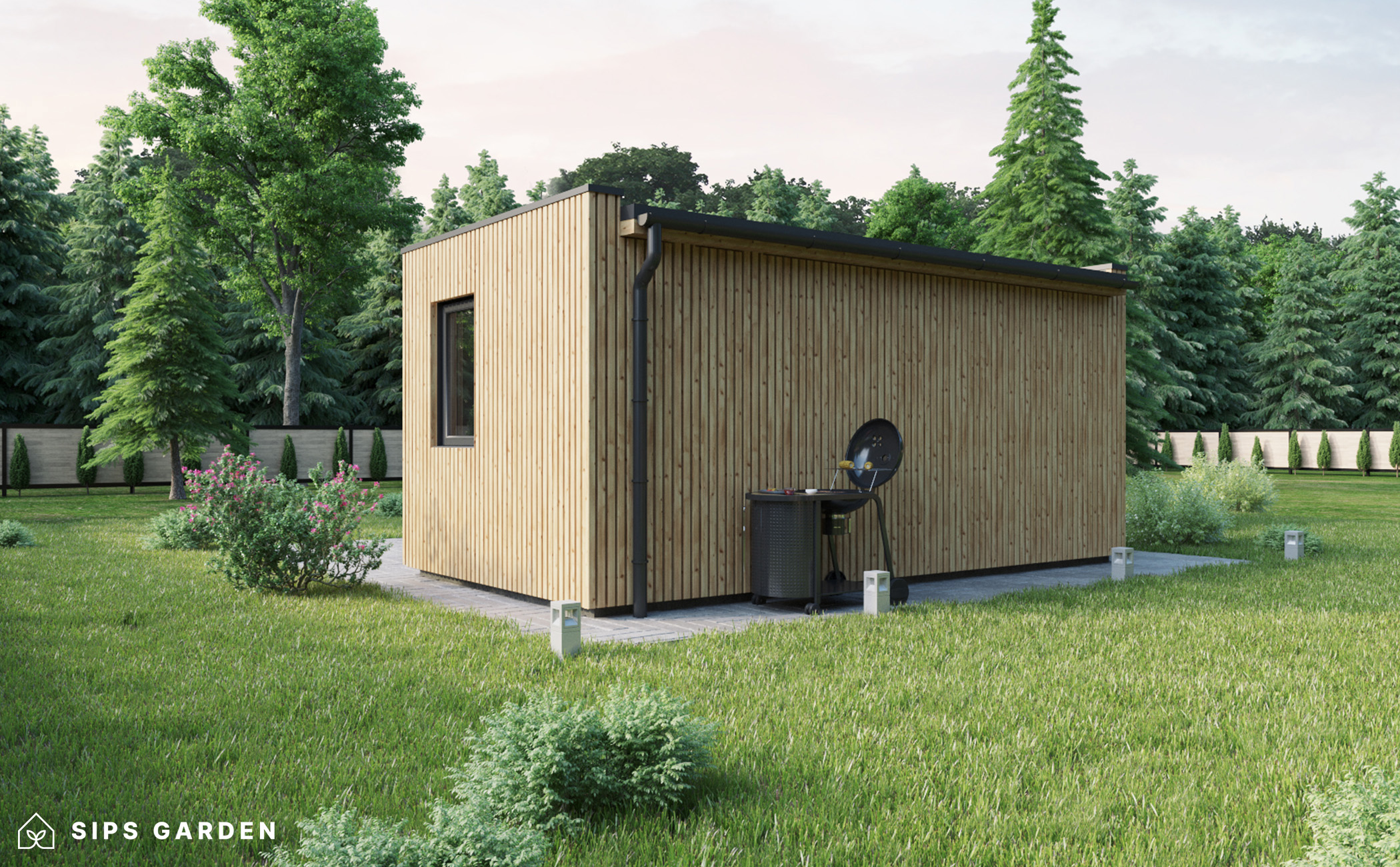 This product is crafted using an advanced, high-quality, and energy-efficient SIPs (Structural Insulated Panels) system, which ensures superior insulation and long-lasting durability. The exterior features anthracite grey PVC double-glazed windows and doors, complemented by an EPDM roof cover, a sturdy steel rain gutter, and elegant steel finishing details, all included as standard elements.