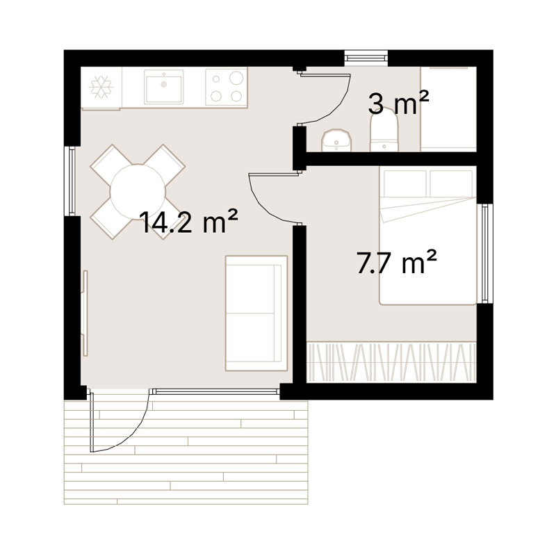 Adjacent to the living room is the 7.7 m² bedroom with ample room for a comfortable bed and storage. With panoramic windows illuminating the space, it’s an ideal spot for restful nights and rejuvenating mornings.